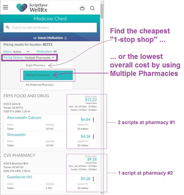 Not only does the Medicine Chest make it easy to re-check the prices of your meds at the click of a button, but it also allows you to see if it’s cheaper to fill some meds at one pharmacy and others at different pharmacies. Just select “Multiple Pharmacies” from the Options Menu at the top of the Medicine Chest screen (NOTE: you need to be logged in to see/use this enhanced price-check).